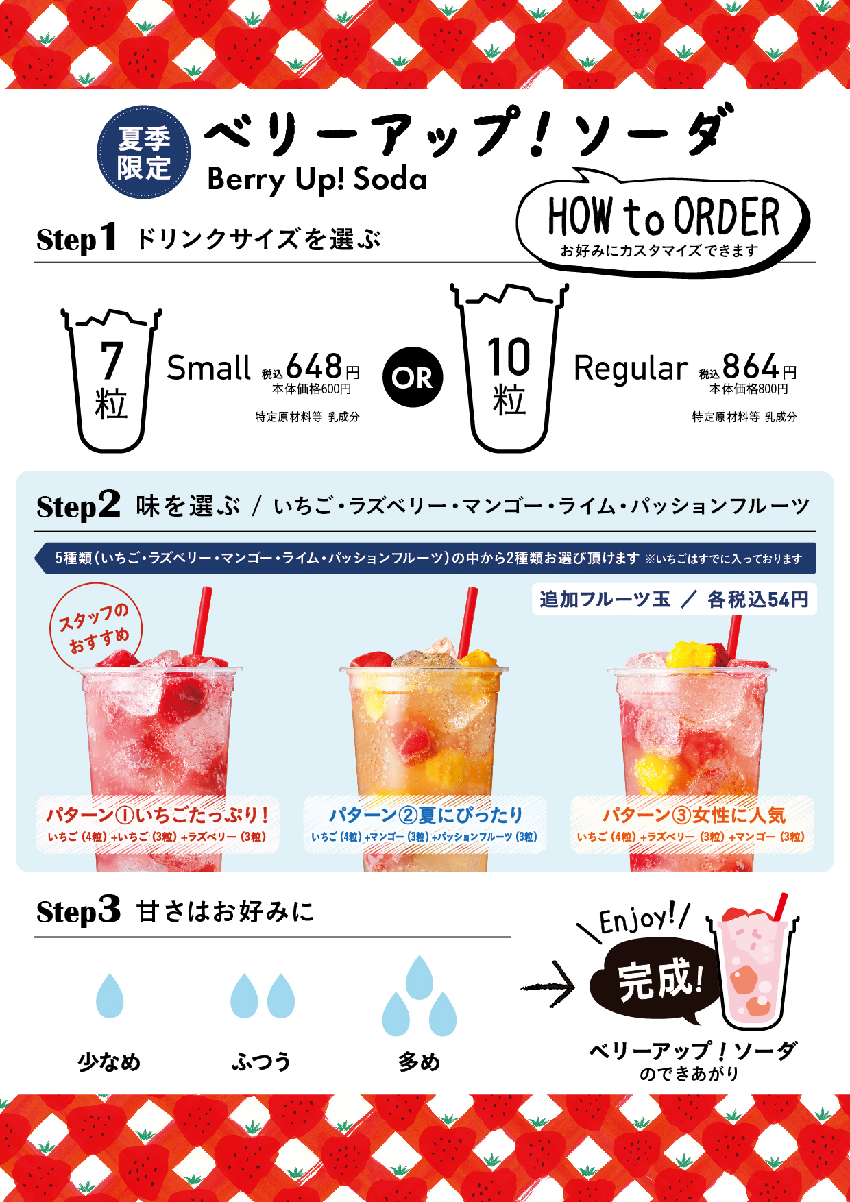 お好きなフルーツを選んで、自分好みの「ベリーアップ!ソーダ」をお楽しみください。